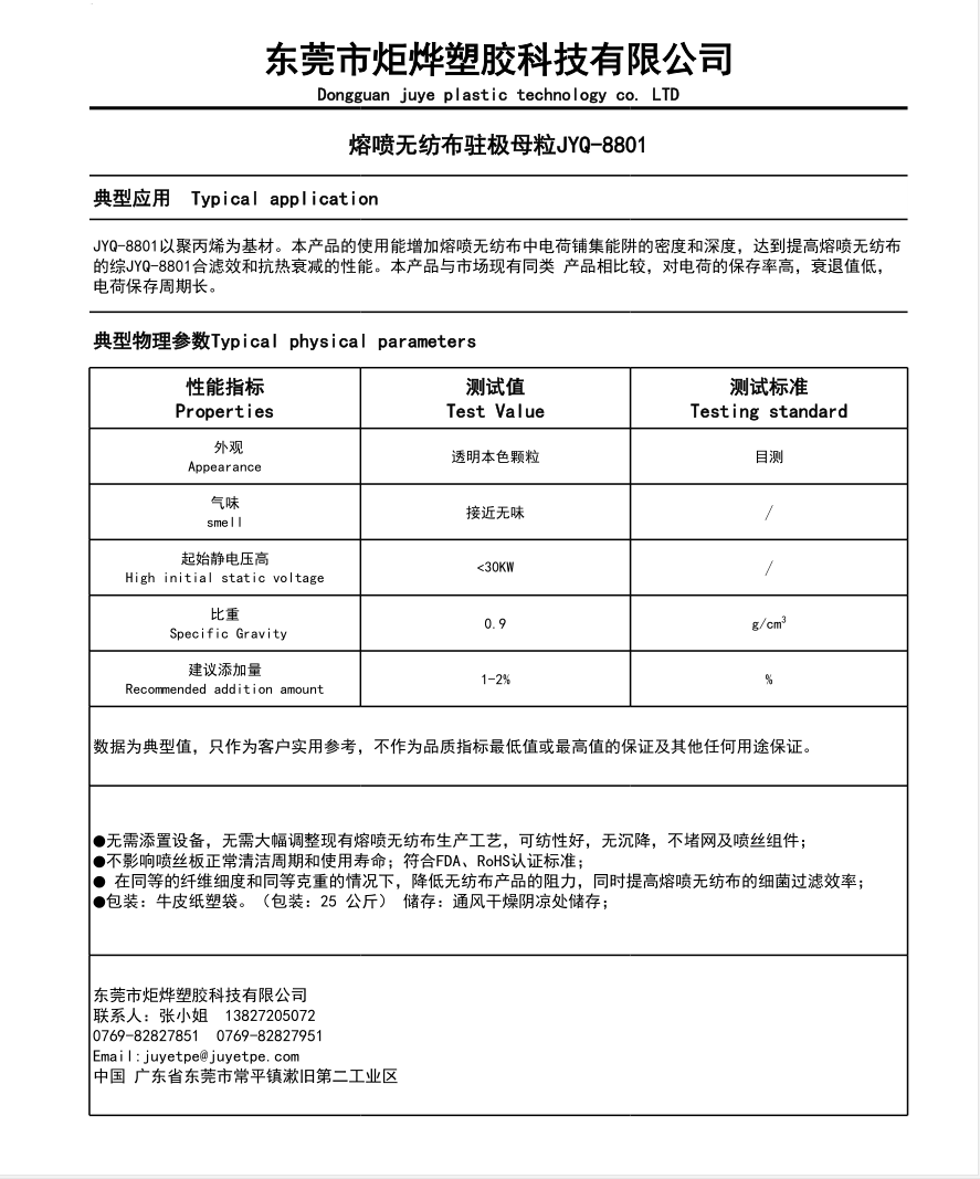 JYQ-8801以聚丙烯為基材。本產(chǎn)品的使用能增加熔噴無紡布中電荷鋪集能阱的密度和深度,達到提高熔噴無紡布的綜JYQ-8801合濾效和抗熱衰減的性能。本產(chǎn)品與市場現(xiàn)有同類 產(chǎn)品相比較,對電荷的保存率高,衰退值低,電荷保存周期長。
